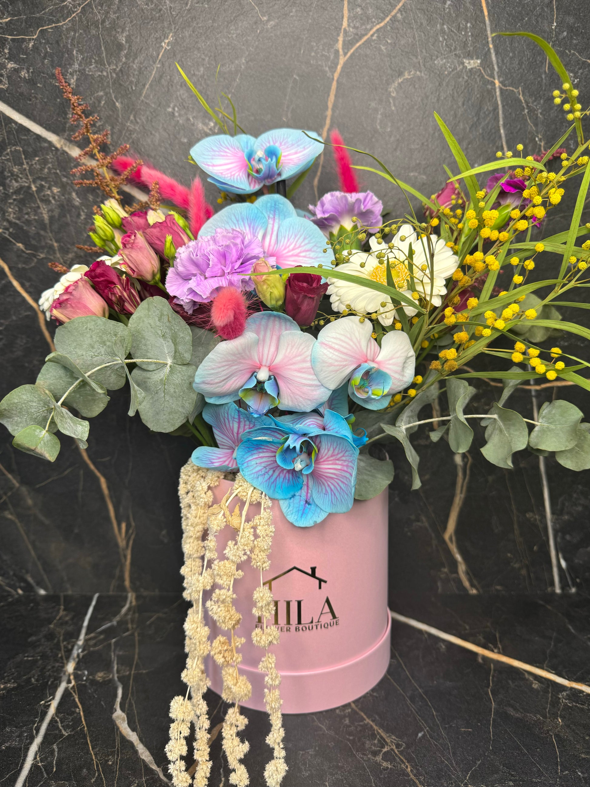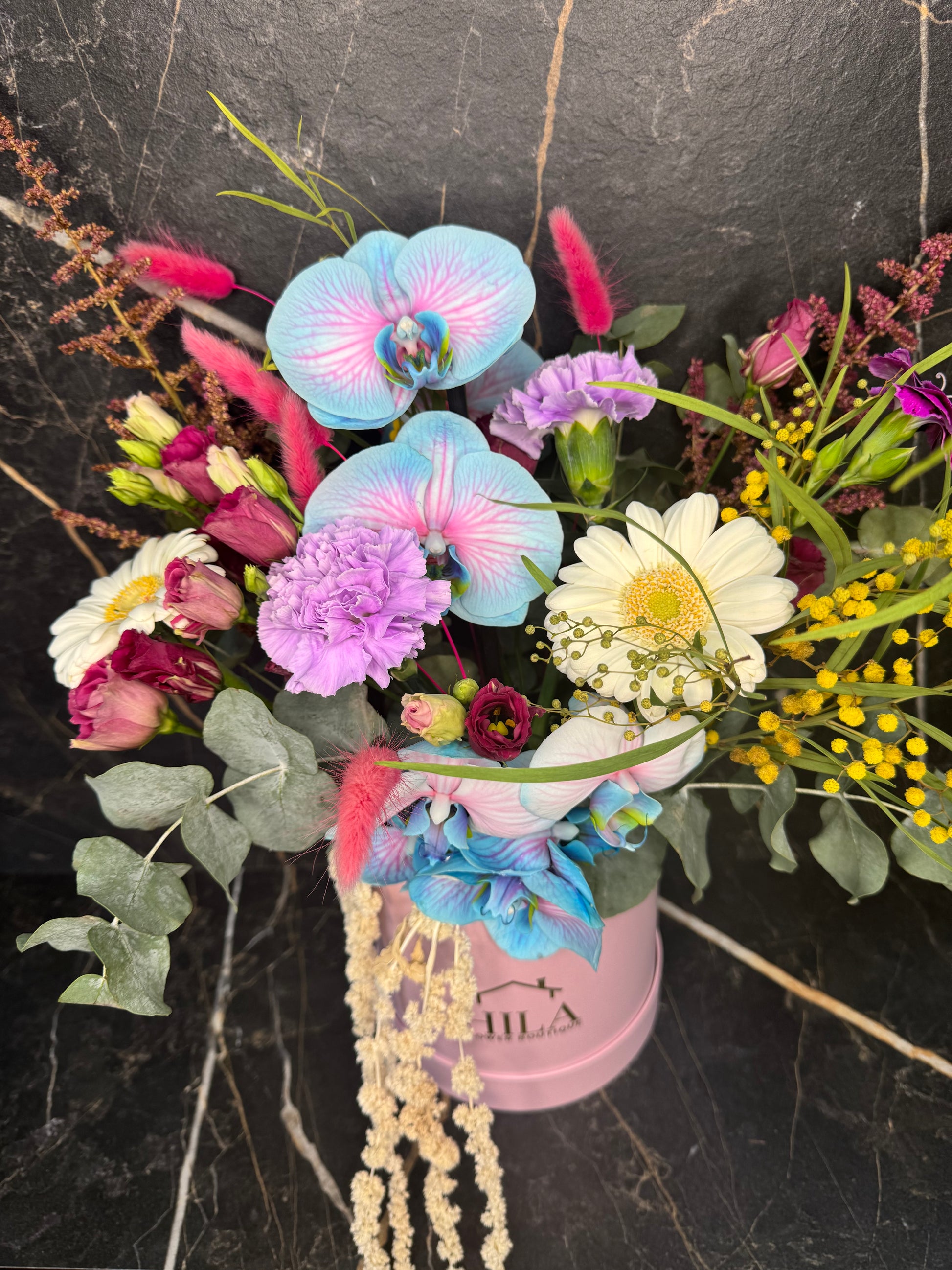האווירה היוקרתית של קופסת הכובע הקלאסית, בשילוב היופי הנצחי של הפרחים הרעננים, הופכת כל חלל ליצירת מופת חזותית שמעוררת התפעלות ומשאירה חותם בלב.