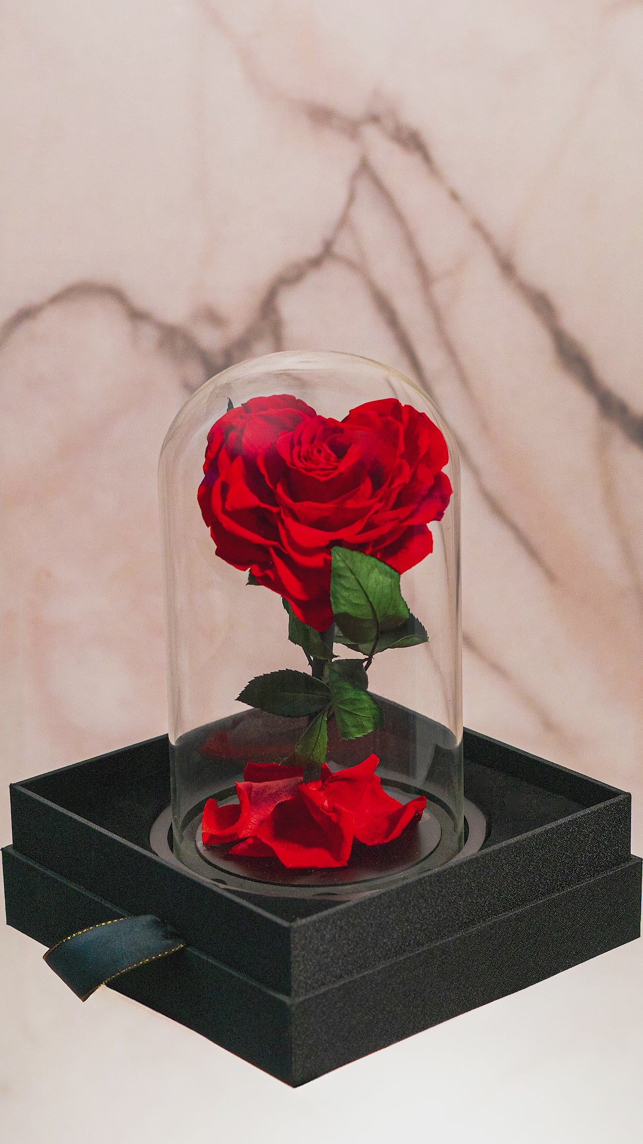 טבלו ביופי הנצחי של ורד נצח יחיד, מוצג באגרטל זכוכית עדין ומאובטח. יצירה קסומה זו היא יותר מסידור פרחים, היא סמל לאהבה נצחית ואלגנטיות מתמשכת.