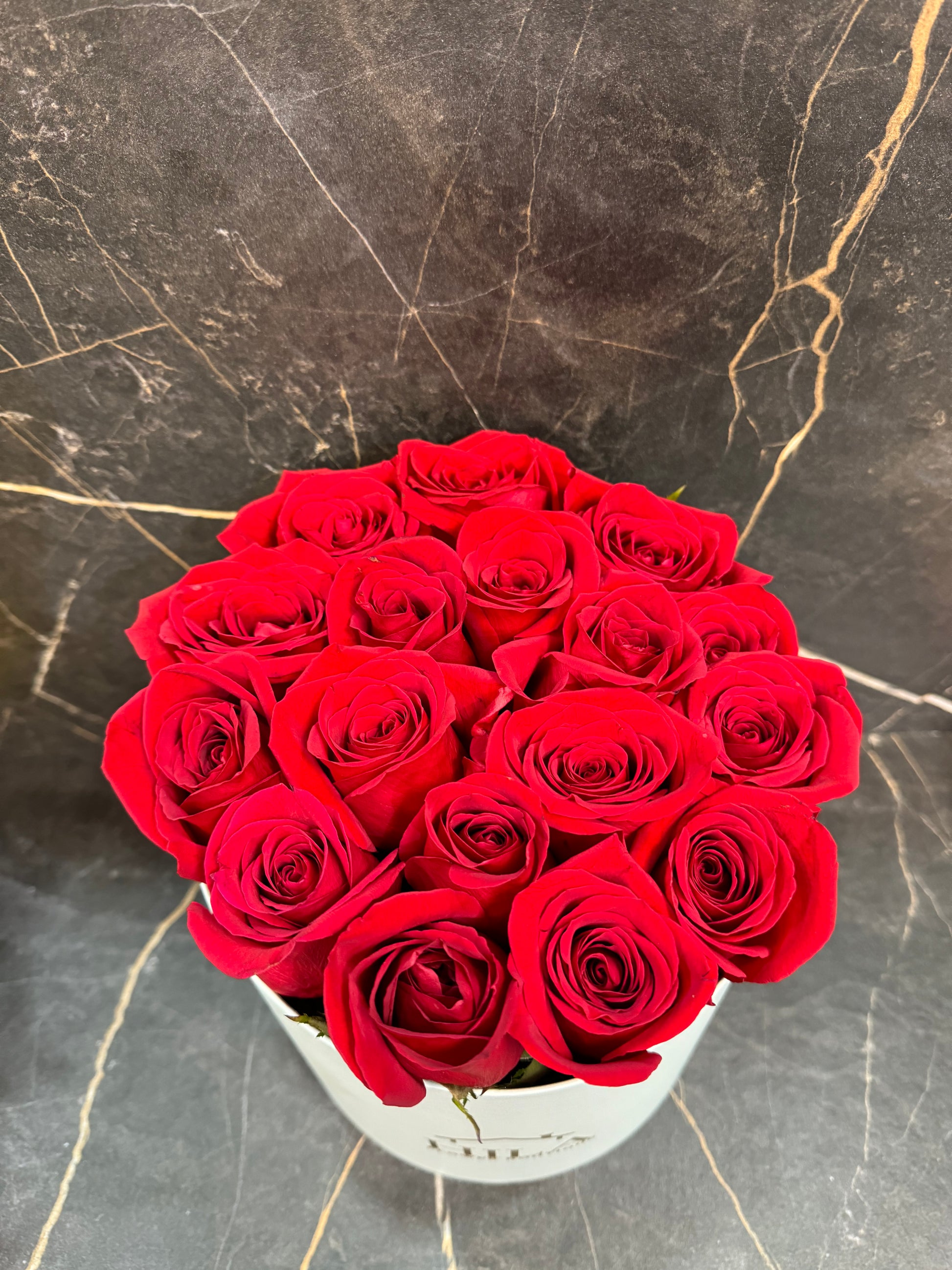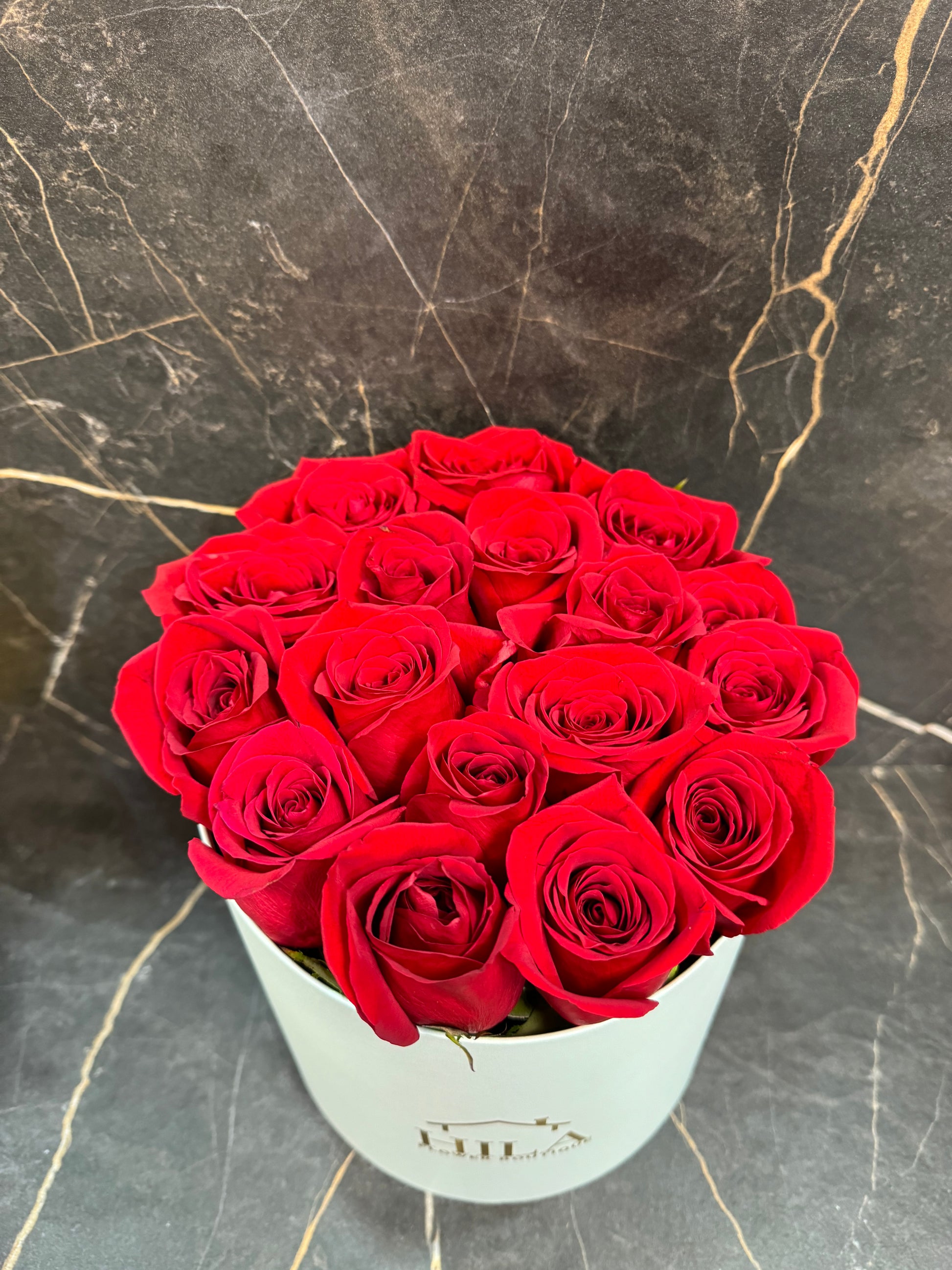 Elevate your moments with Majestic Petals - 20 fresh Ecuadorian roses in a luxurious classic hat box, a harmonious blend of elegance and natural beauty.