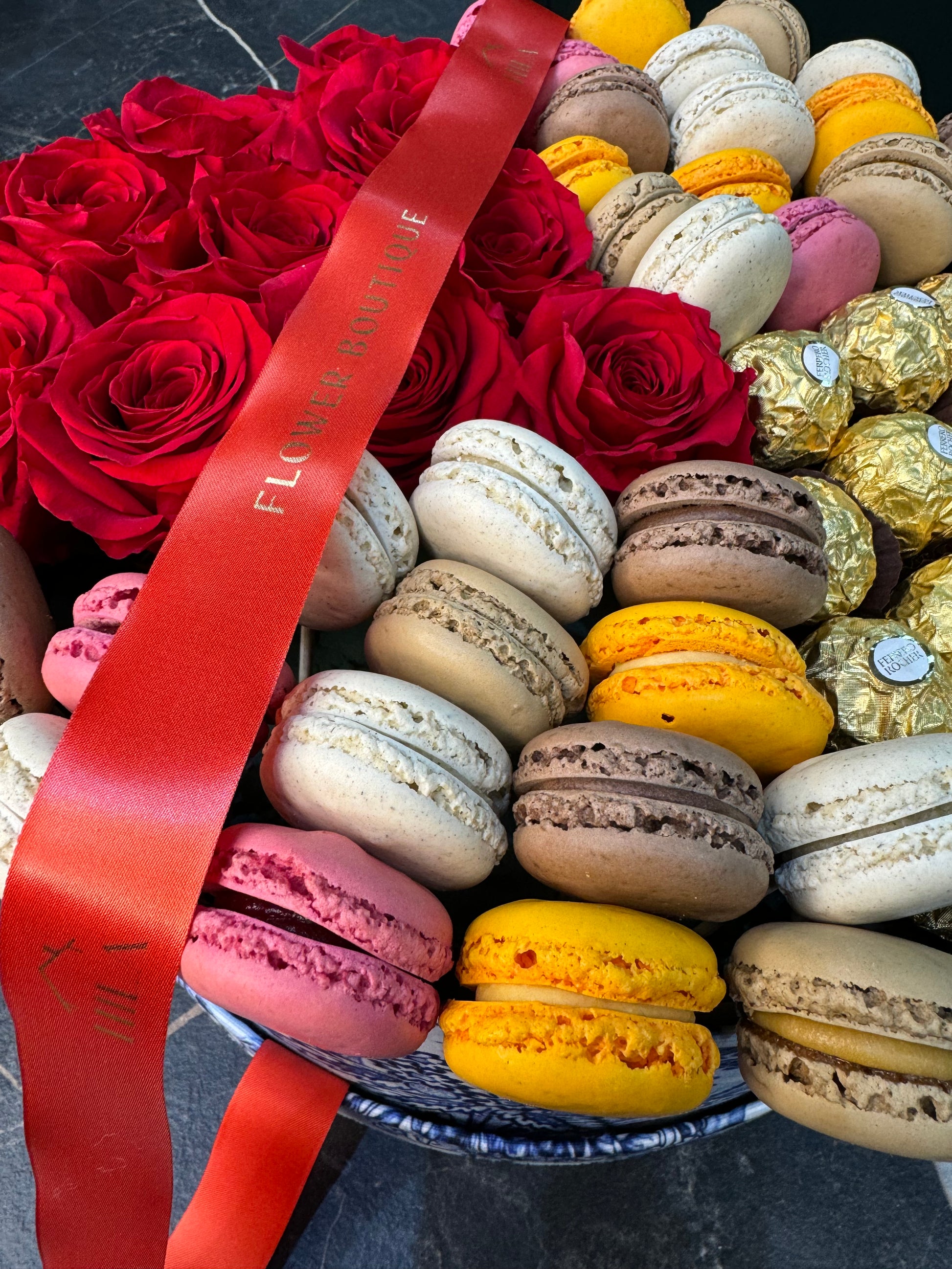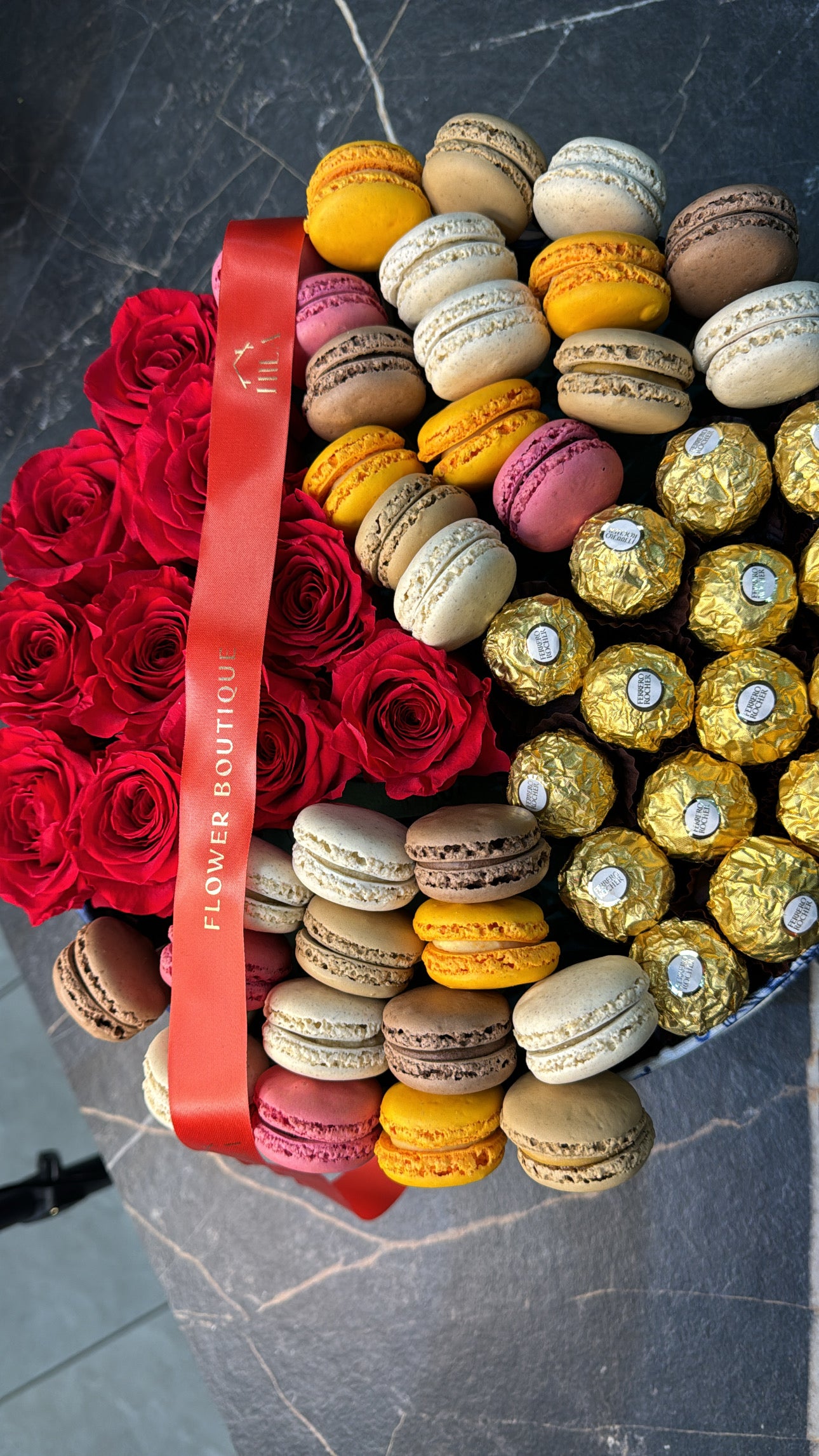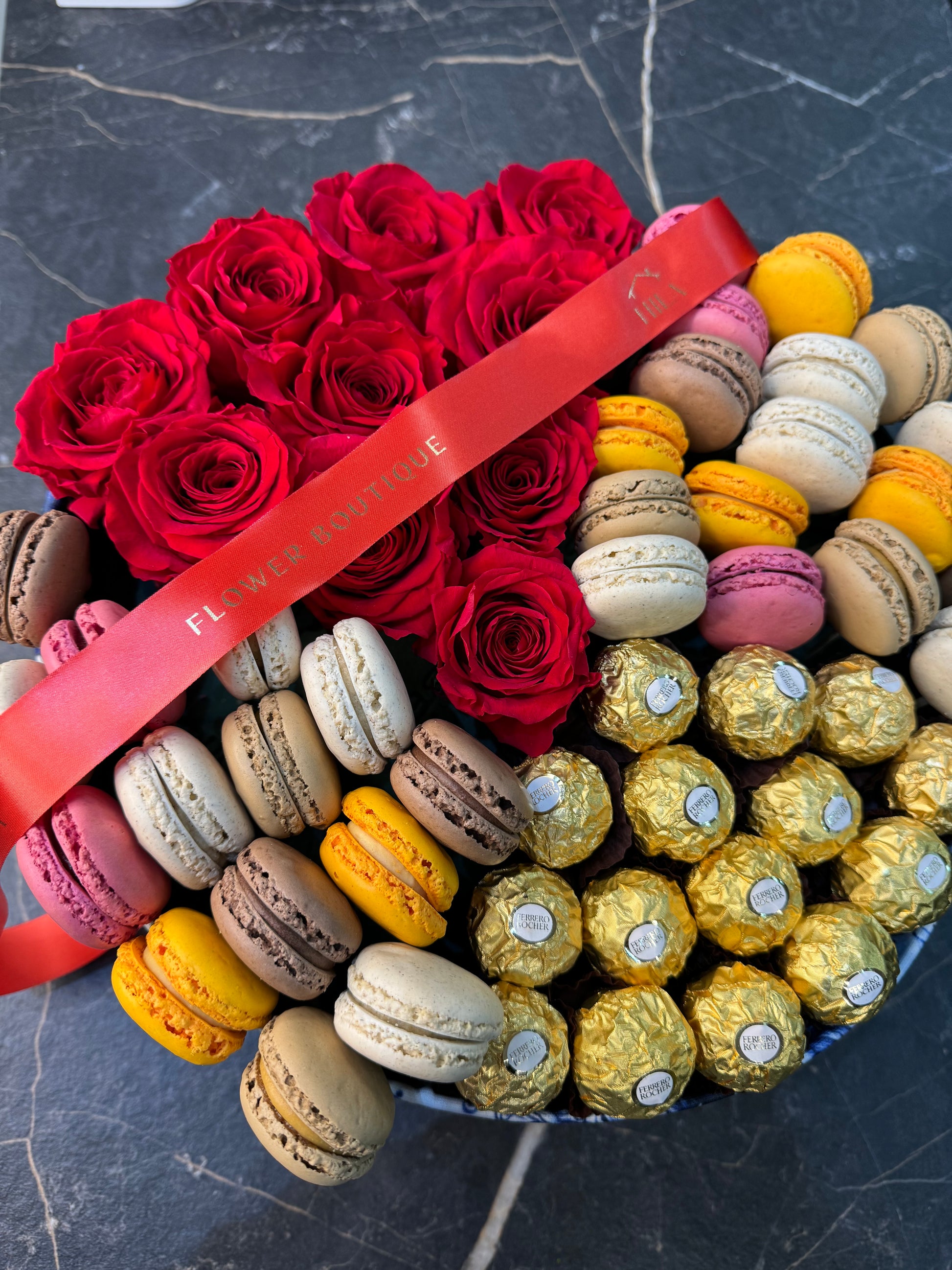 Immerse your senses in a harmonious blend of fresh Ecuadorian roses, delicately intertwined with the decadence of Ferrero Rocher and/or the sweet elegance and delicate flavours of macaroons. Alternatively, explore our range of Eternity Roses gift sets, a perfect fusion of luxury and everlasting charm.